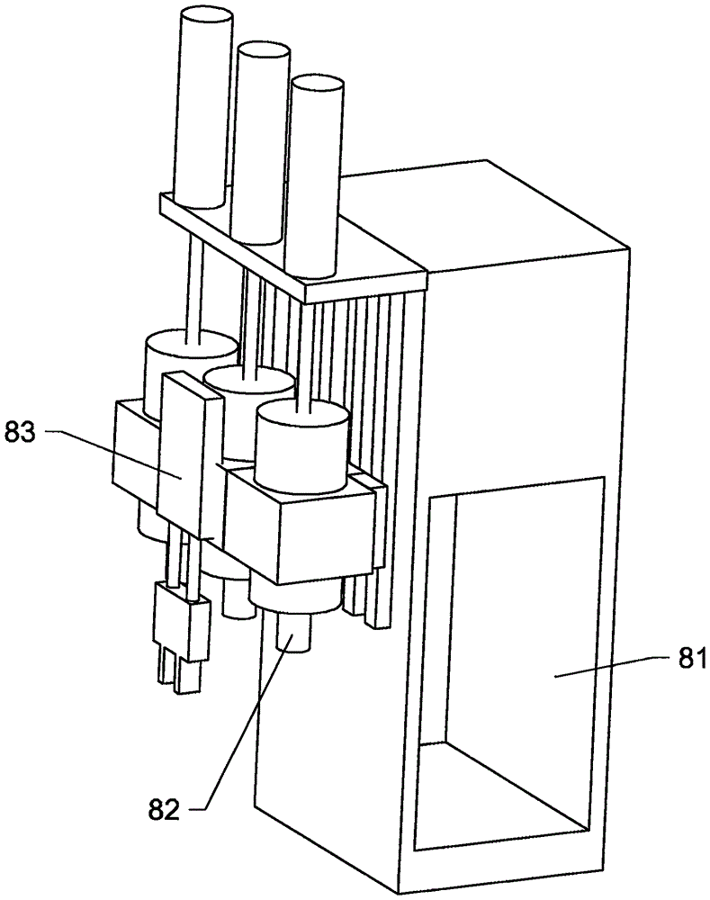 The eyeglass inner frame processing knife set device 8 includes a seat body 81 slidingly engaged with the first lateral guide rail, and the seat body 81 is provided with a cutting blade 82 movable in the vertical direction. A first manipulator 83 is also provided on the eyeglass inner frame processing knife set device 8, and the first manipulator 83 is used to grab the material to be processed and put it into the eyeglass inner frame processing fixing jig 5 for fixing.